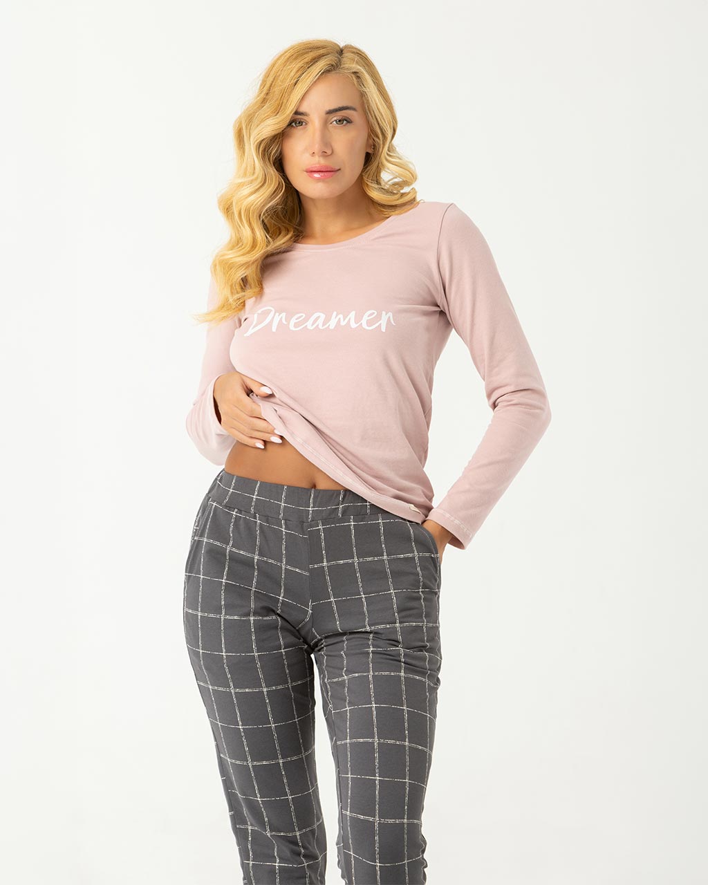 Ženska pidžama siva sa printom „Dreamer“. Moderna i udobna pidžama za svakodnevno nošenje i odmor. Mekan pamuk pruža prijatnost tokom cele noći.