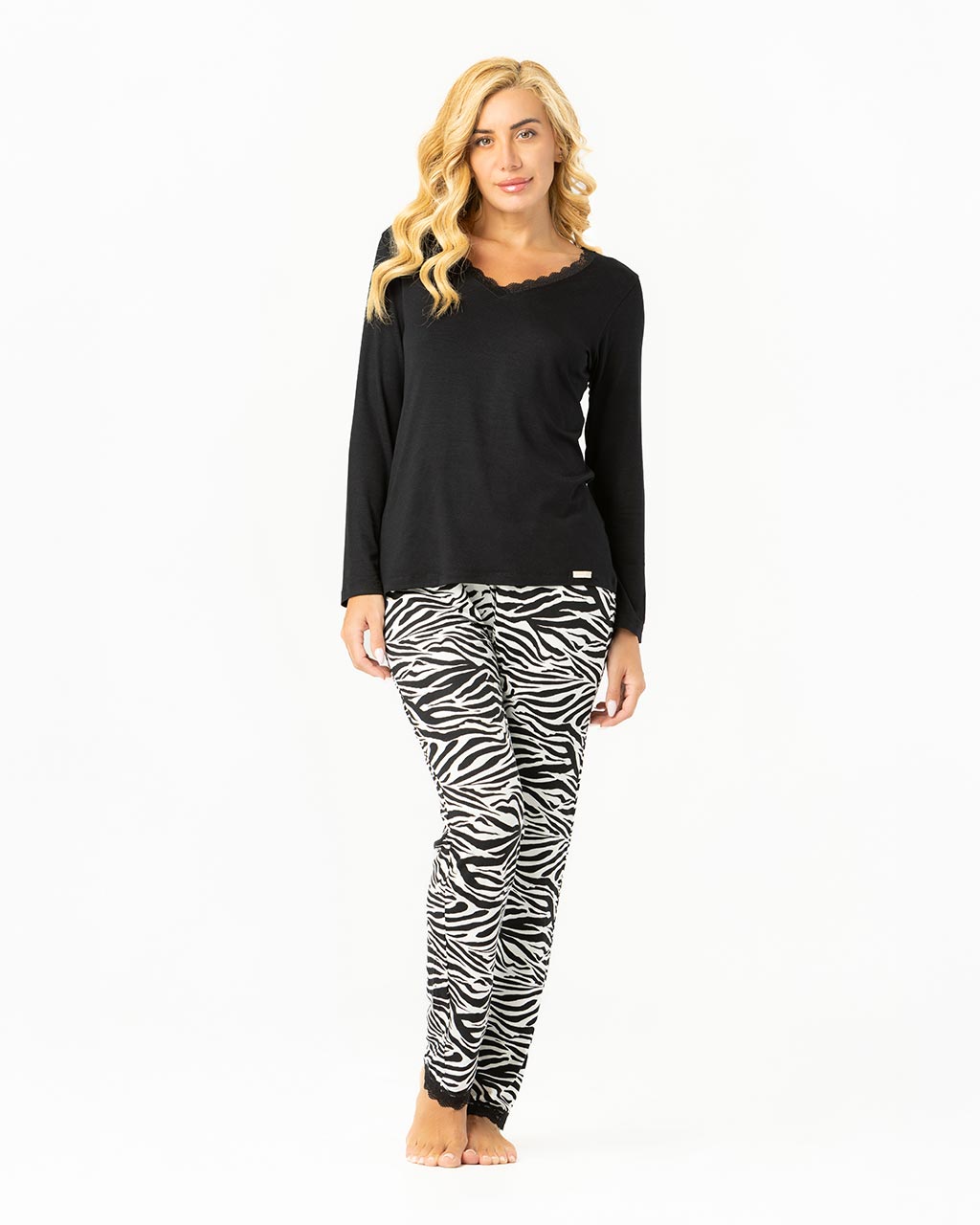 Viskozna pidžama Kaya sa crnim gornjim delom na blagi V izrez ukrašen čipkom i donjim delom sa zebra dezonom koji ima čipkaste detalje pri dnu.