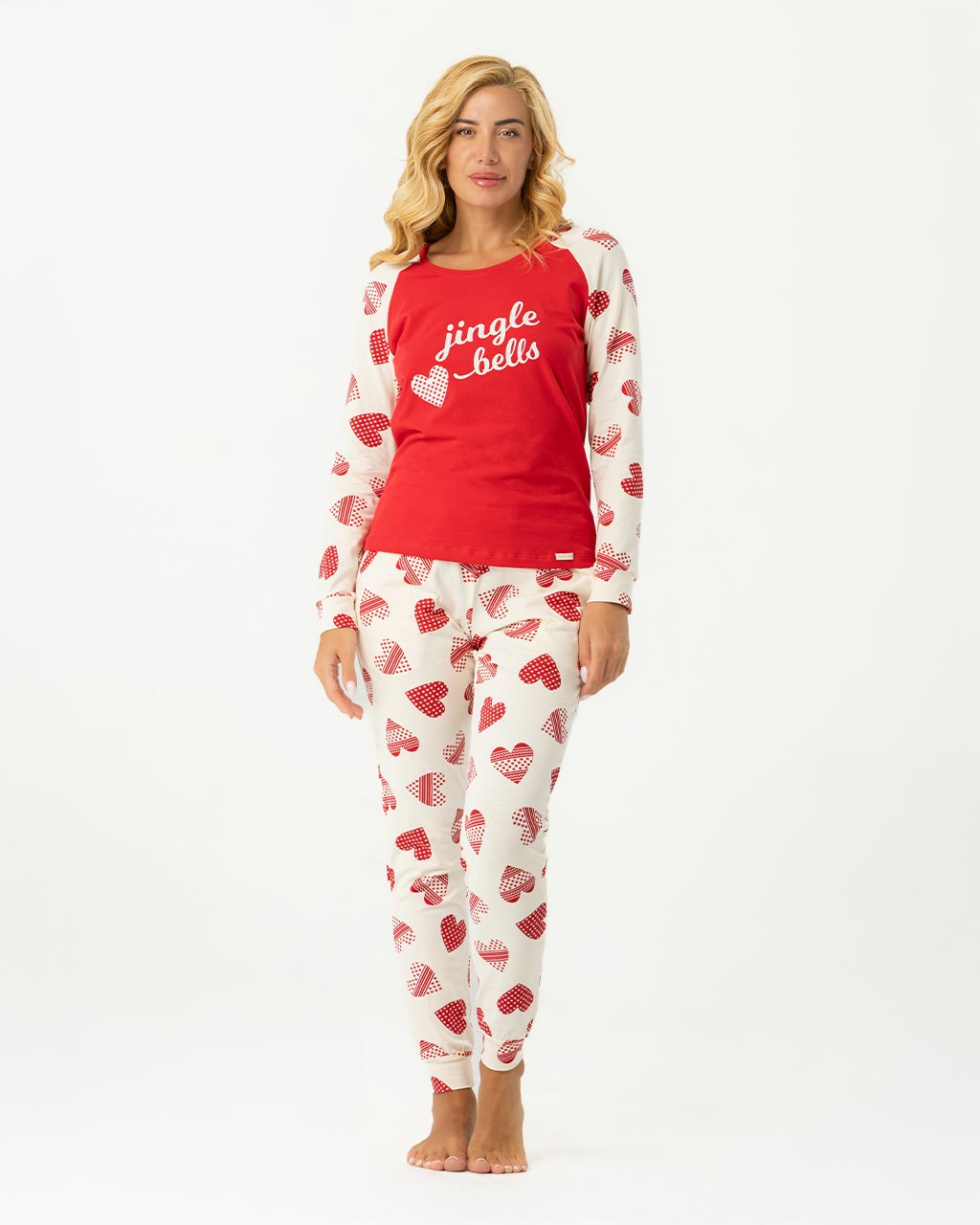 Pidžama Riva izrađena je od mekanog, udobnog pamuka koji omogućava prijatan san i celodnevnu udobnost kod kuće. Donji deo je šaren i ukrašen crvenim srcima dok gornji deo je jednobojan, sa štampom. Šareni rukavi stvaraju lep kontrast i povezuju komplet.