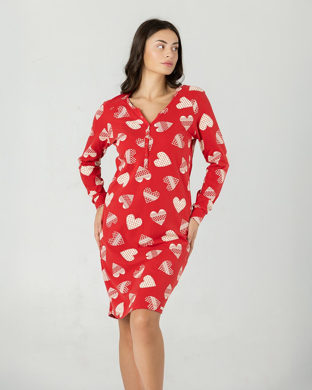 Dugi rukavi i lagan, ravno sečen kroj pružaju osećaj komfora, dok živa crvena boja i razigran print srca unose vedrinu i šarm u svaki korak.